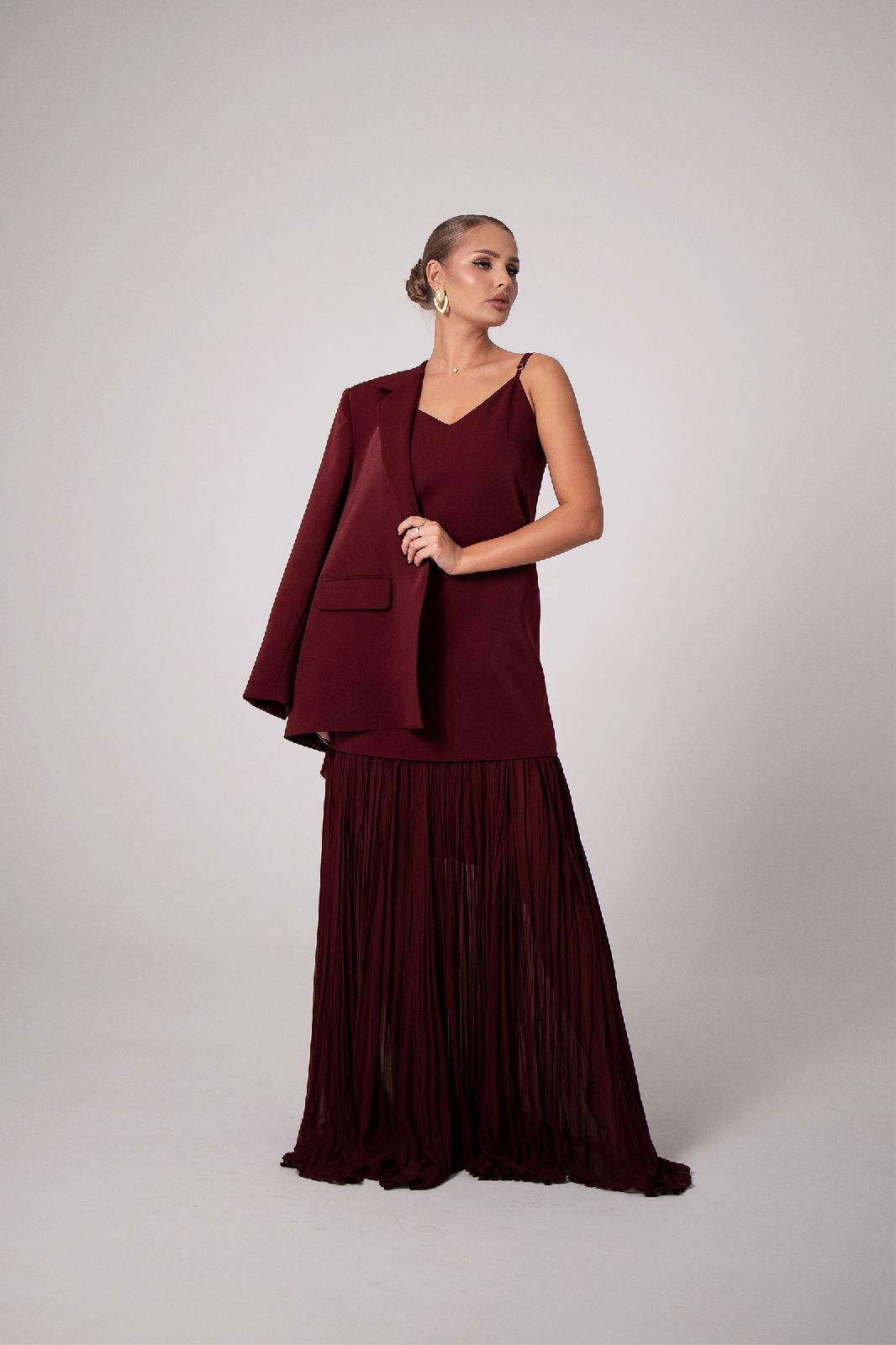 Платье на тонких бретелях переходящее в струящуюся плиссированную юбку в пол создаёт эффектный и женственный силуэт. Свободный жакет добавляет нотку современного шика.