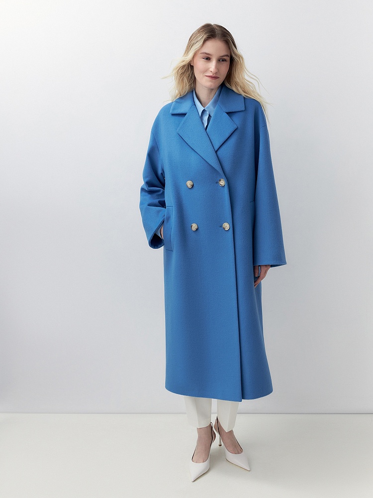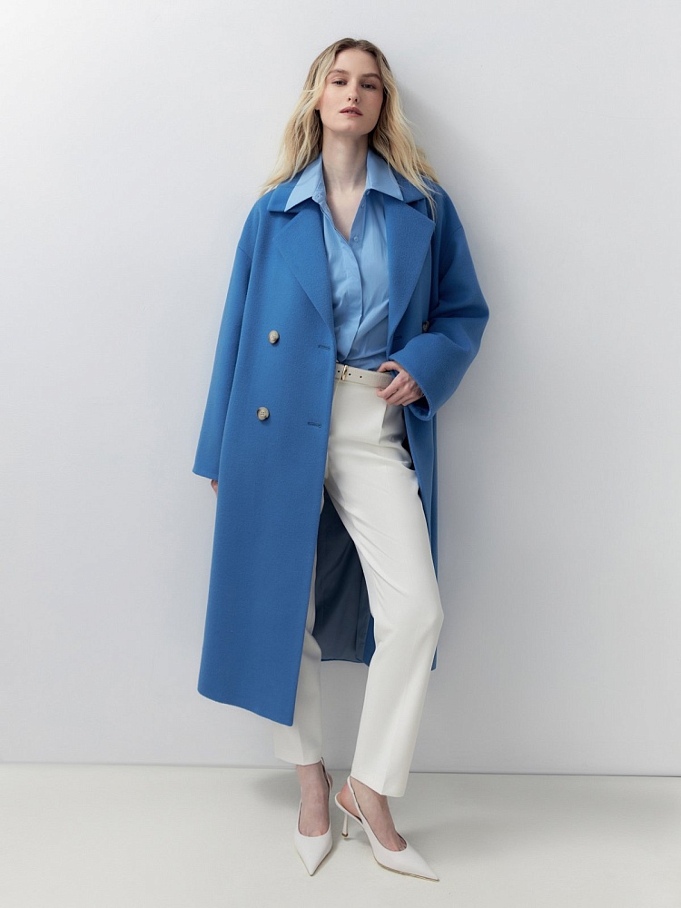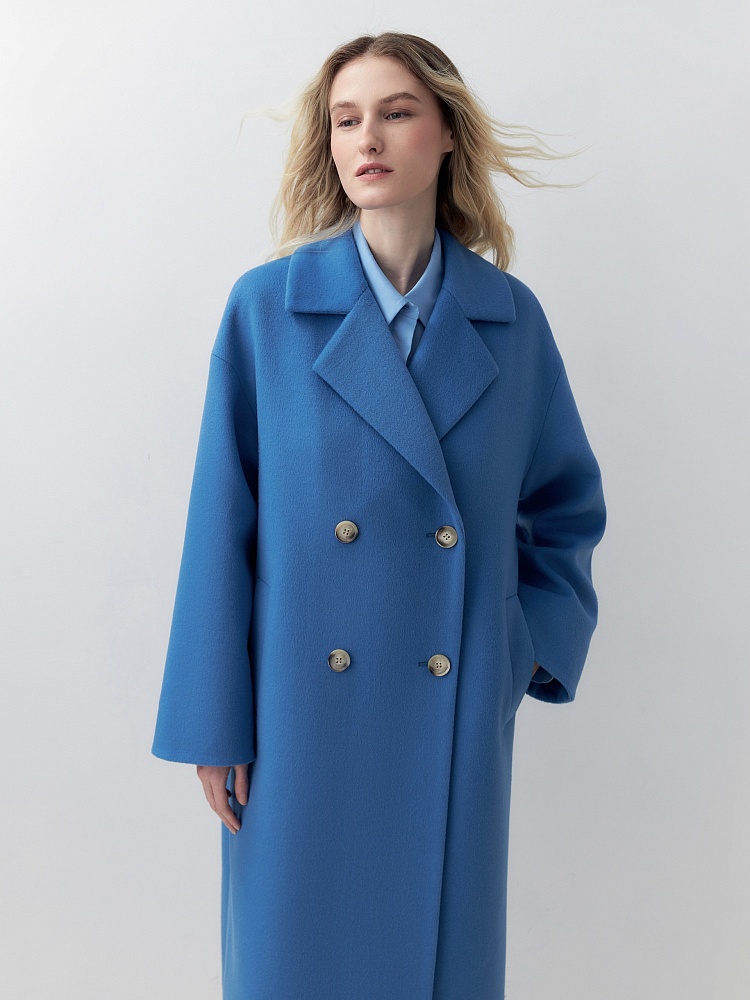 Двубортное пальто прямого силуэта из пальтовой ворсовой ткани в ярком весеннем васильковом цвете.